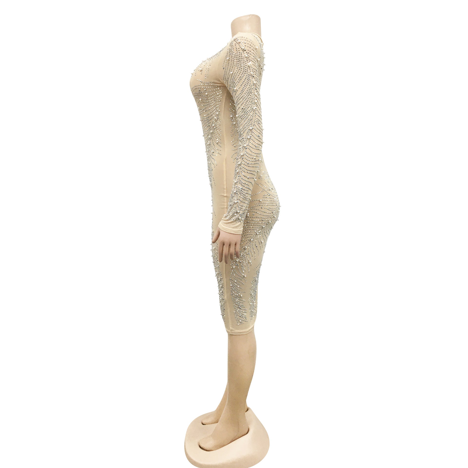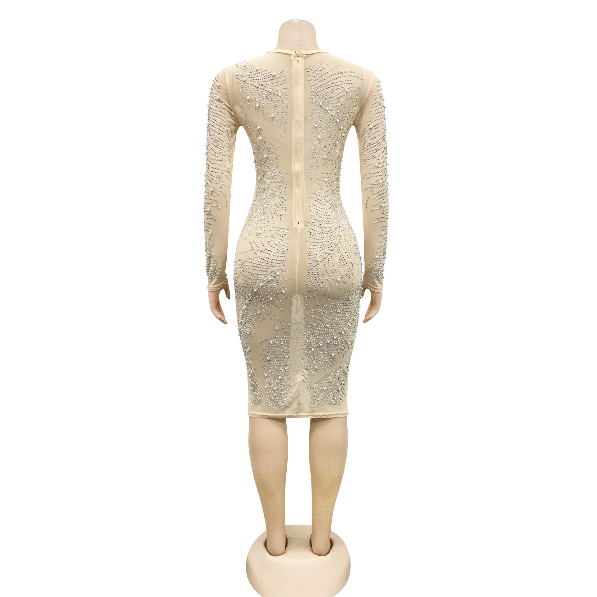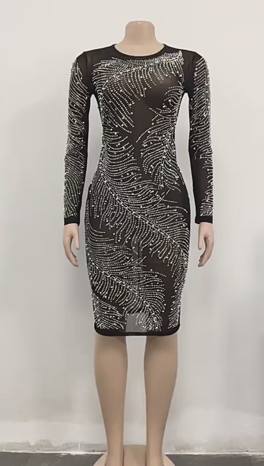Long Sleeve See Through Crystal Embellished Dress